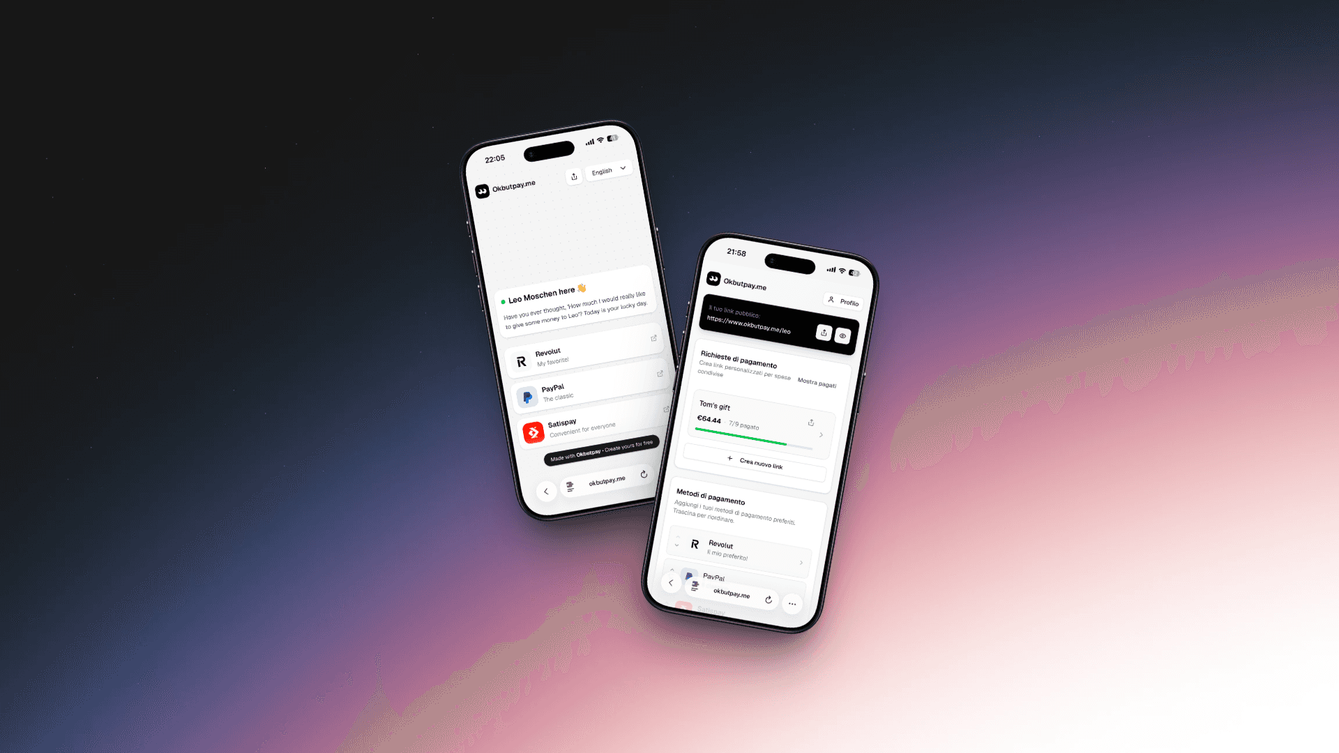 Okbutpay.me is a personal page where you collect all your payment methods. Instead of sharing multiple links for PayPal, Revolut, Satispay, IBAN — you share one.